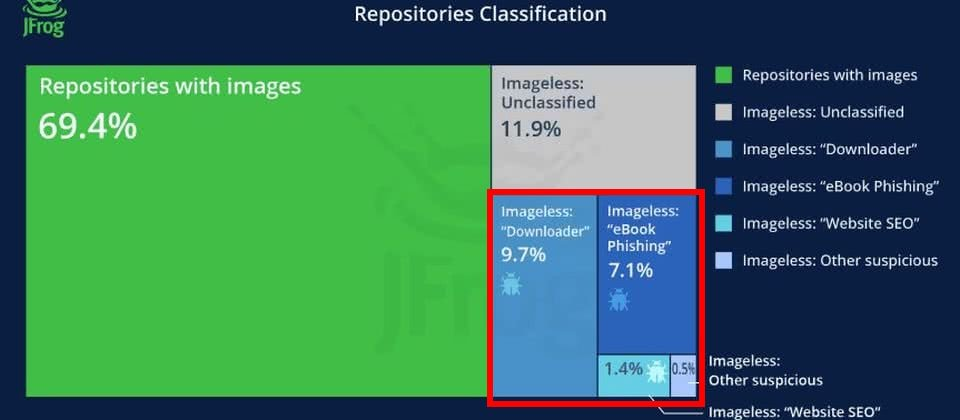 JFrog 的研究就發現,Docker Hub 上有大量的此類型攻擊方式,主要使用於三種主要 campaign,分別是下載器、電子書釣魚、以及網站/SEO 類別。
